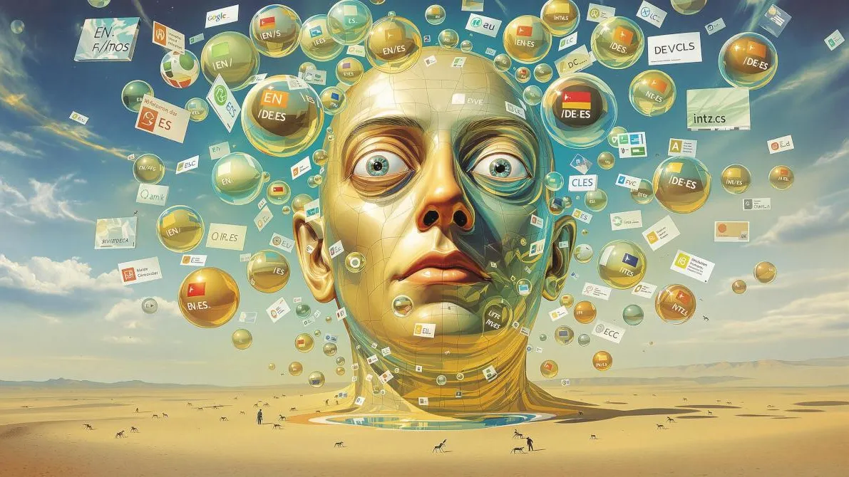 Surreales digitales Kunstwerk im Stil von Dalí: Ein gigantischer goldener Kopf erhebt sich aus einer Wüstenlandschaft, umgeben von schwebenden Glassblasen mit Sprachcodes (EN/DE/ES). Kleine Figuren und Kamele wandern im Vordergrund durch die Wüste. Der Kopf spiegelt sich in einem türkisfarbenen Wasserspiegel. Technologie-Icons und Sprachkennzeichnungen schweben in transparenten Blasen um den Kopf herum.