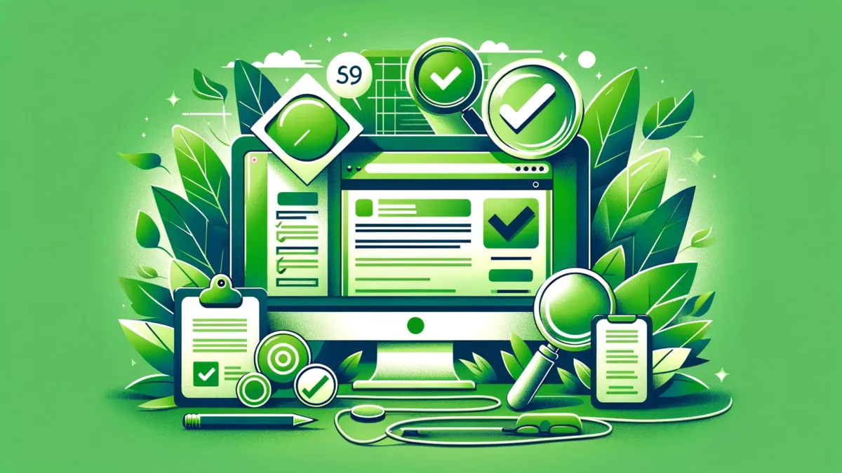Das Bild zeigt einen stilisierten Computermonitor, auf dem eine Webseite angezeigt wird, umgeben von verschiedenen Testwerkzeugen wie Lupen, Checklisten und Fehlermeldungen in Grüntönen. Diese Elemente symbolisieren den Prozess der Überprüfung einer Webseite auf Barrierefreiheit. Das Design vermittelt einen professionellen und thematisch fokussierten Ansatz zur Überprüfung der Zugänglichkeit von Webinhalten.