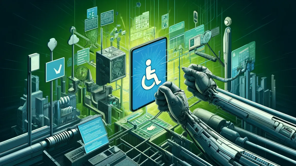 Das Bild illustriert das Thema "Robustheit" in der digitalen Barrierefreiheit. Es zeigt ein zuverlässiges digitales System, das verschiedene assistive Technologien unterstützt, darunter Bildschirmleser, adaptive Tastaturen und Mobiltelefone mit deutlich sichtbaren Barrierefreiheitseinstellungen. Die Gestaltung betont Stabilität und Unterstützung durch robuste Strukturen und verstärkte Verbindungen. Das Farbschema des Bildes besteht aus verschiedenen Grüntönen. Dieses Bild wurde mit KI-Technologie generiert.