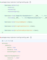 Ein weiterer Vergleich zwischen YAML- und PHP-Konfigurationen, der die automatische Konvertierung von Konfigurationsdateien demonstriert. Oben ist die PHP-Version zu sehen, darunter die ursprüngliche YAML-Datei.