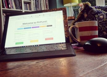 Laptop PHPUnit Startseite mit Bücherregal und Kaffeetasse im Hintergrund
