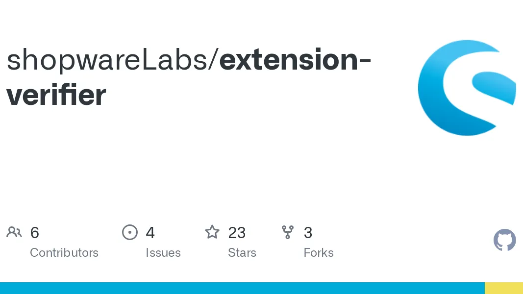 GitHub-Projektseite von shopwareLabs/extension-verifier mit Shopware-Logo. Das Tool dient zur Analyse und Validierung von Shopware-Erweiterungen. Darunter Angaben: 6 Mitwirkende, 4 Issues, 23 Sterne, 3 Forks.