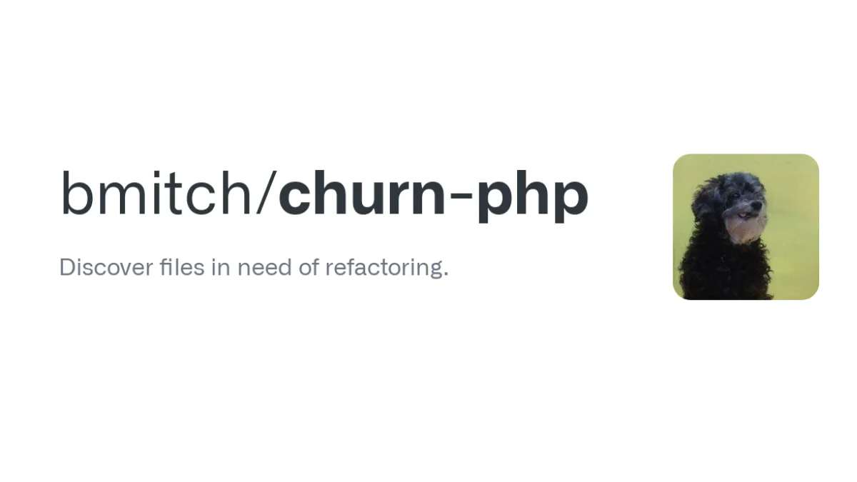 Screenshot des GitHub-Repositories „churn-php“ mit einem kleinen Bild eines Hundes. Das Projekt zielt darauf ab, PHP-Dateien zu erkennen, die refaktoriert werden müssen.