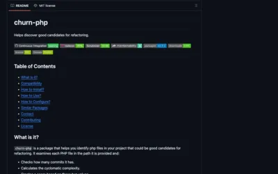 Screenshot der ReadMe-Datei des churn-php-Repositories. Die Beschreibung hebt hervor, dass das Tool dabei hilft, PHP-Dateien für Refactoring-Kandidaten zu identifizieren. Außerdem ist eine Inhaltsübersicht mit Links zu Dokumentation, Installation und Nutzung zu sehen.