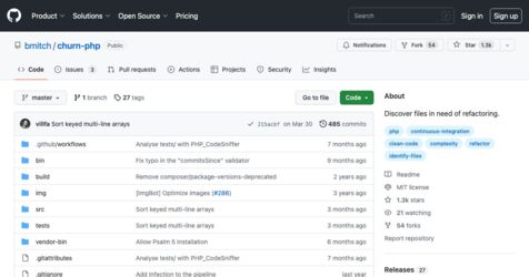 Screenshot des GitHub-Repositories „churn-php“ von bmitch. Zu sehen sind Verzeichnisstrukturen, Commit-Details und Tags. Rechts eine kurze Beschreibung: „Discover files in need of refactoring“ und relevante Tags wie „php“ und „clean-code“.