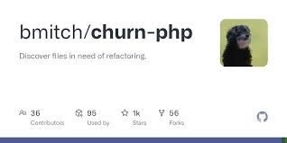 Eine komprimierte Darstellung des Repositories „bmitch/churn-php“. Es zeigt wichtige Metriken wie 1k Sterne, 56 Forks und 36 Beiträge sowie den Text „Discover files in need of refactoring“.