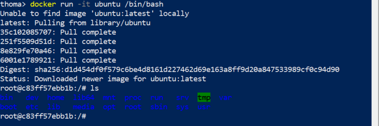 Docker-Befehl zur Erstellung eines Ubuntu-Containers in einer CLI-Umgebung mit den sichtbaren Verzeichnislisten nach dem Start.
