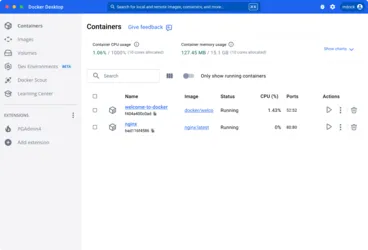 Docker Desktop Benutzeroberfläche, die laufende Container, ihren Status und Ressourcenverbrauch anzeigt.